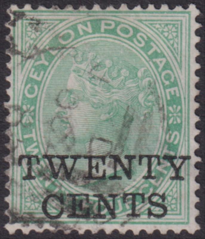 Ceylon 1885 "TWENTY / CENTS" ovpt on 24c QV pale green, p14, crown CC wmk. GS 165. Cat £38. FU. (Image)