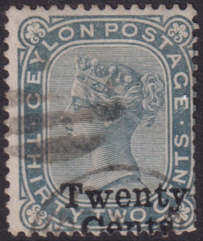 Ceylon 1885 "Twenty / Cents" ovpt on 32c QV dark grey, p14, crown CC wmk. SG 166a. Cat £65. GU. (Image)