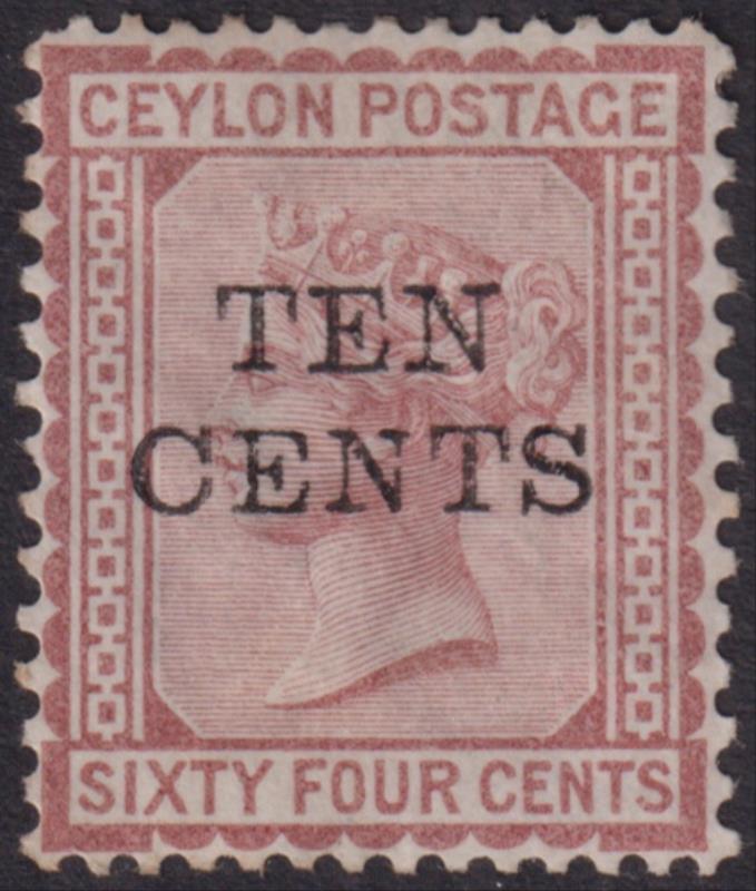 Ceylon 1885 "TEN / CENTS" ovpt on 64c QV red-brown, p14 x 12½, crown CC wmk. SG 174. Cat £100. HH mint. (Image)