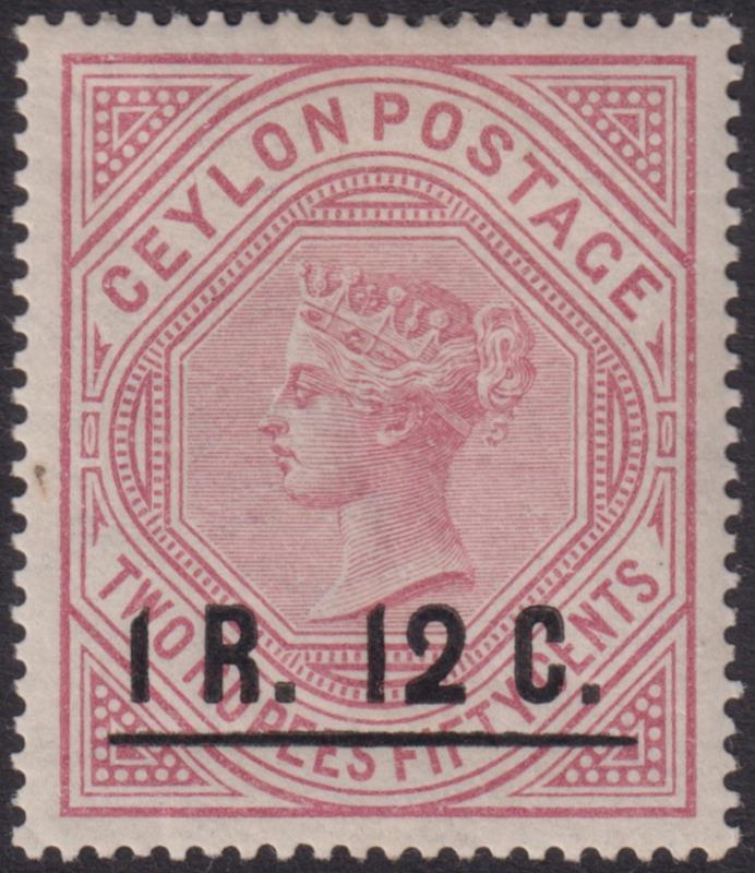 Ceylon 1885 "1R.12C" ovpt on 2r50 QV dull rose, p14, crown CC wmk. SG 193. Cat £65. Mint. (Image)
