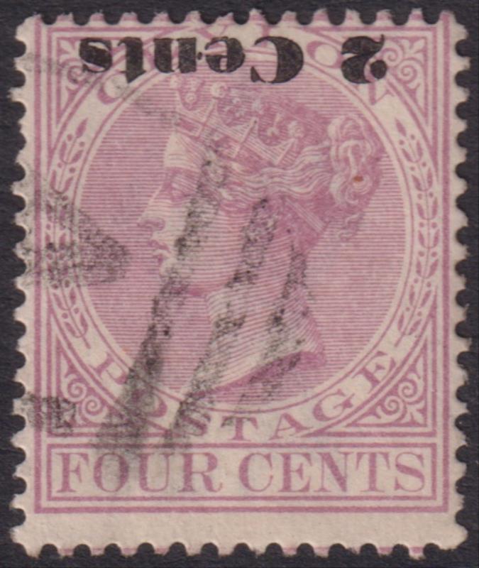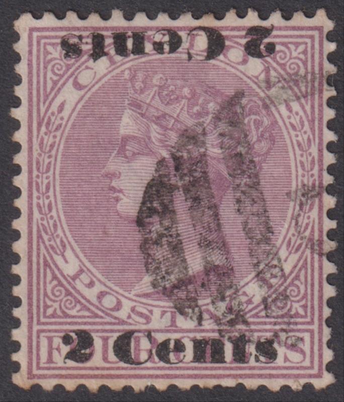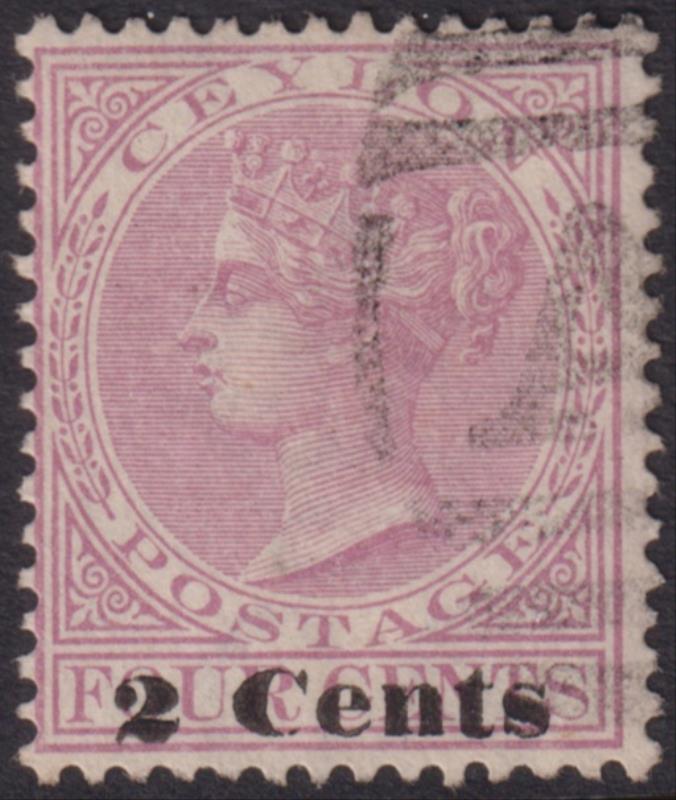 Ceylon 1888-90 "2 Cents" ovptd, invtd on 4c QV rosy mauve, p14, crown CA wmk. SG 210a. Cat £42. FU. (Image)