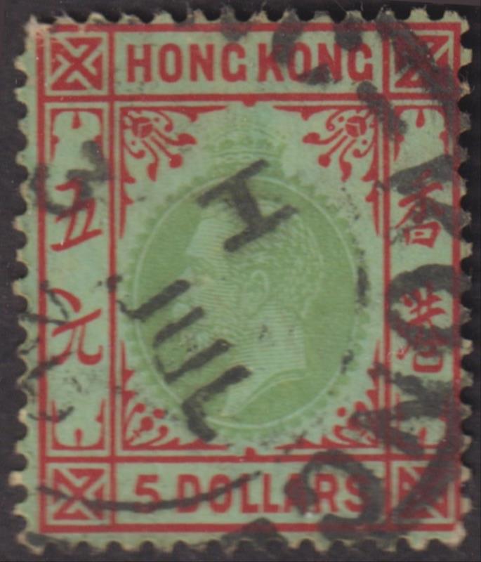 3022 U imageHong Kong 1925 $5 GV green & red-emerald, multiple script CA wmk. SG 132. Cat £95. GU/FU. (Image)
