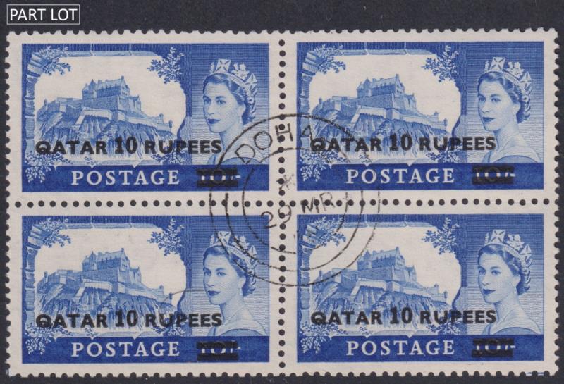 3106 U imageQatar 1957 2R-10R ovpts (type 1) on GB 2/6d-10/- Castles set of 3 blocks of 4, canc central Doha cds 29 MR 58. SG 13-15. Cat £120. FU. (Image)