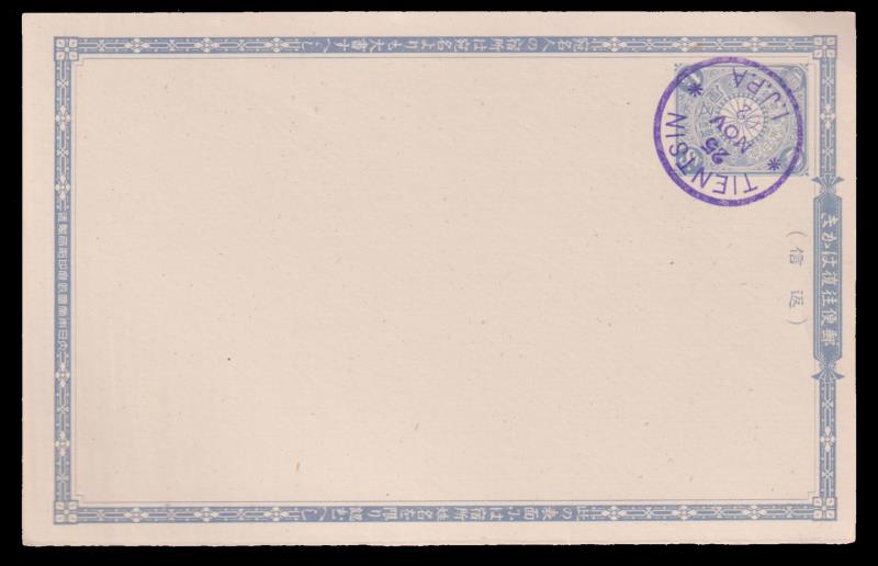China 1902 Japanese 1½sen (blue) postal stationery p/c bearing fine TIENTSIN/25/NOV/02 I.J.P.A purple cds. Very fresh & most