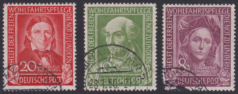 3280 U imageGermany-West 1949 Refugees Relief Fund short set of 3 (8 + 2pf, 10 + 5pf, 20 + 10pf). SG 1039-41. Cat £72. FU except 8+ 2pf with small ink blot as part of cds pmk. (Image)