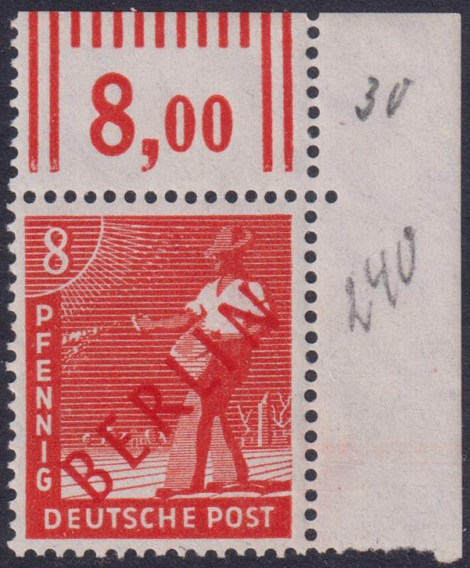 Germany-West Berlin 1949 8pf "Berlin" ovpt in red (top RH corner with sheet marking), very light gum disturbance. SG B23. Cat