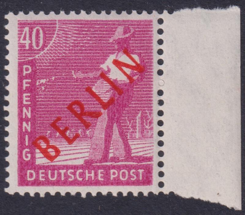 Germany-West Berlin 1949 40pf "Berlin" ovpt in red, with RH selvedge. SG B29. Cat £110. MUH. (Image)