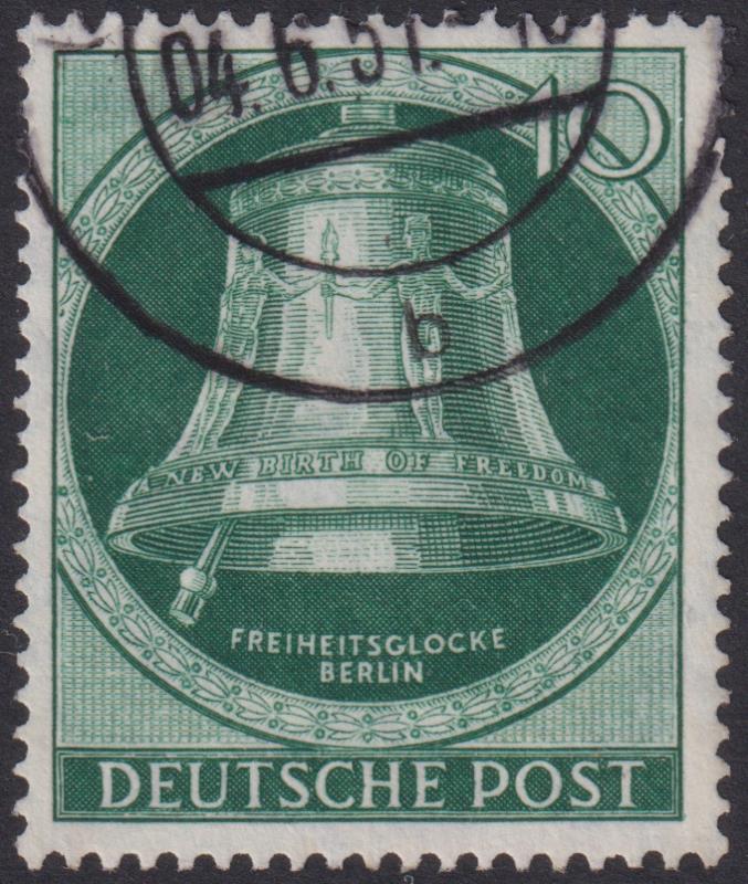 Germany-West Berlin 1951 10pf Freedom Bell green, clapper at left. SG B76. Cat £34. FU. (Image)