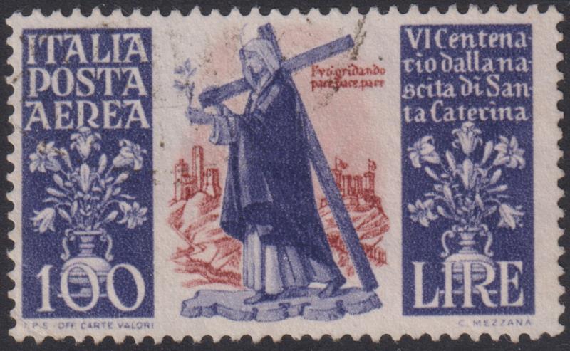 3321 U imageItaly 1948 100L St Catherine of Siena violet & red-brown. SG 702. Cat £65. FU. (Image)