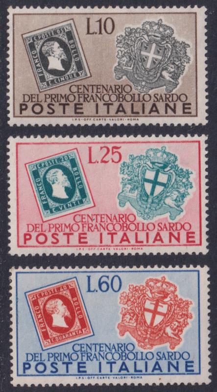 3329 * imageItaly 1951 Sardinian Stamp Centenary set. SG 798-800. Cat £34.75. MUH. (Image)