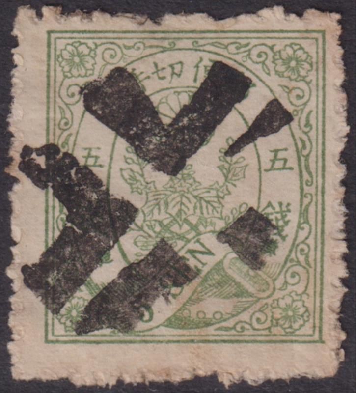 3332 U imageJapan 1876 5s Imperial Crest & Kiri Branches, beta cancel. Scott 54A. Cat US$110. GU. (Image)