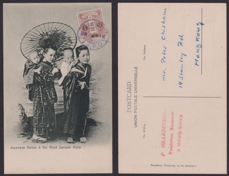3333 C imageJapanese Post Offices in China 1918 PPC (Japanese Babes & the Main Servant Kobe) with ½s adhesives (on view side) cancelled CANTON/14.9.18/I.J.P.O to Hong Kong. VF condition. (Image)
