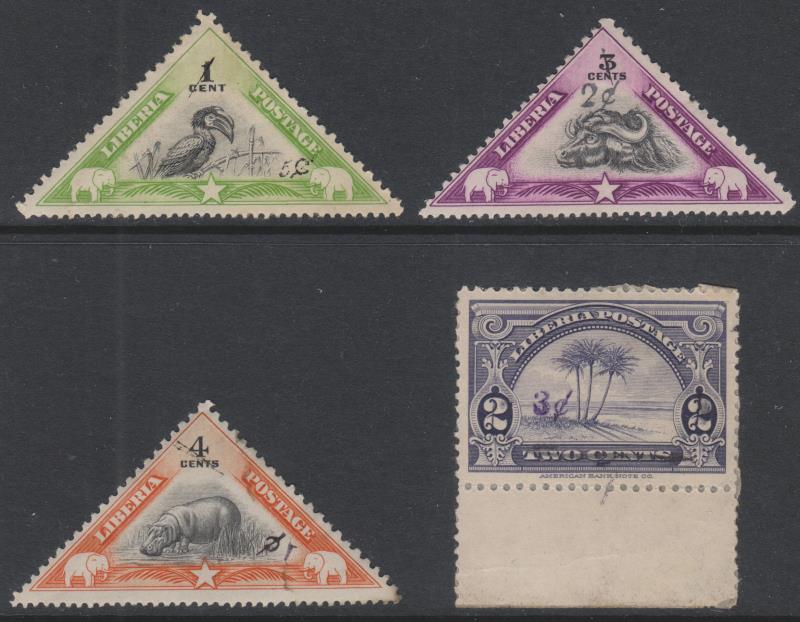 3361 M imageLiberia 1944 3c on 2c Palm Trees, 1c on 4c Hippopotamus, 2c on 3c Buffalo & 5c on 1c Hornbill surcharges. SG 632, 634, 635, 637. Cat £210. Mint. (Image)