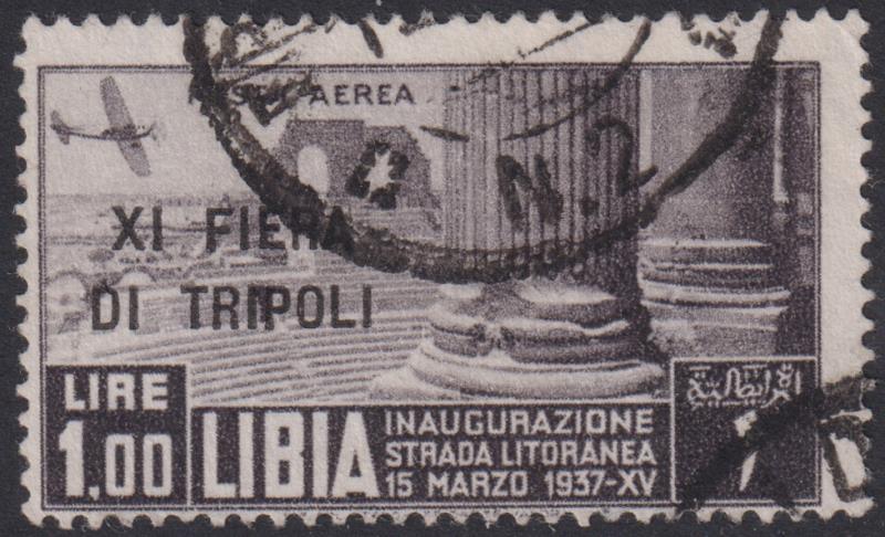 3362 U imageLibya 1937 1L 11th Tripoli Trade Fair ovpt on 1937 Highway Opening black. Airmail. SG 87. Cat £50. GU/FU. (Image)