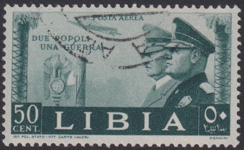 3363 U imageLibya 1941 50c Rome-Berlin Axis (Hitler & Mussolini) blue-green, airmail. SG 130. Cat £40. FU. (Image)