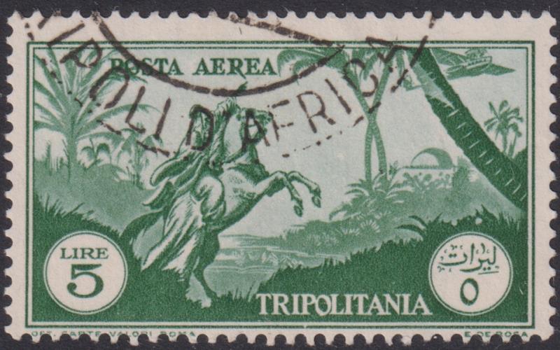 3366 U imageLibya-Tripolitania 1931 5L Airmail green (plane over horse & rider). SG 122. Cat £35. Top value. (Image)