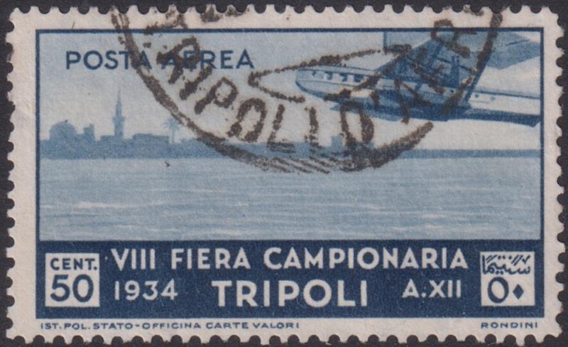 3367 U imageLibya-Tripolitania 1934 50c 8th Tripoli Trade Fair grey-blue (flying boat over Tripoli) Airmail. SG 190. Cat £29. FU. (Image)