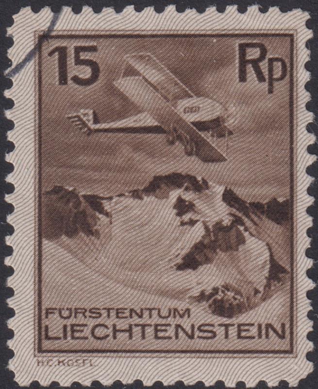 3368 U imageLiechtenstein 1930 15r Air sepia (biplane over mountain). SG 110. Cat £24. FU. (Image)