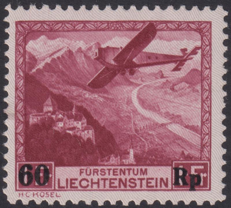 3370 M imageLiechtenstein 1935 60c on 1F Air claret (plane over castle), small adhesion on gum. SG 150. Cat £60. Mint. (Image)