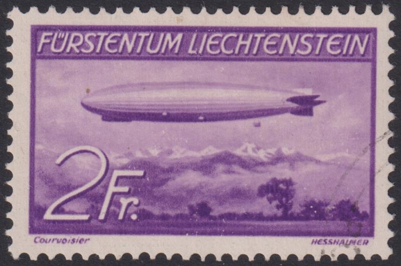 3371 U imageLiechtenstein 1936 2F Air bright violet (airship "Hindenburg" over mountains), faint corner cds cancel. SG 152. Cat £150. FU. (Image)