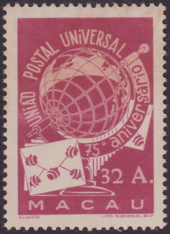 3377 * imageMacau 1949 32a UPU 75th Anniv purple (envelopes encircling globe). Gum discoloured. SG 424. Cat £200. MUH. (Image)