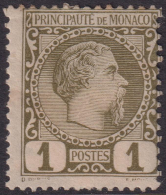 Monaco 1885 1c Prince Charles III olive, adhesion. SG 1. Cat £33. Mint. (Image)