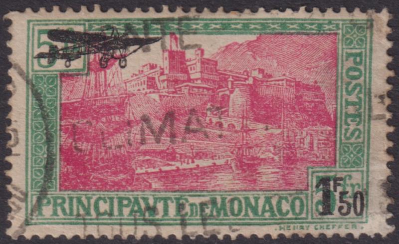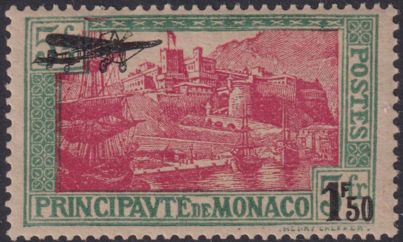 Monaco 1933 1F50 ovpt (in black) on 1924 5F Monaco Castle red & green. Airmail. Outline of early monoplane as part of ovpt. SG