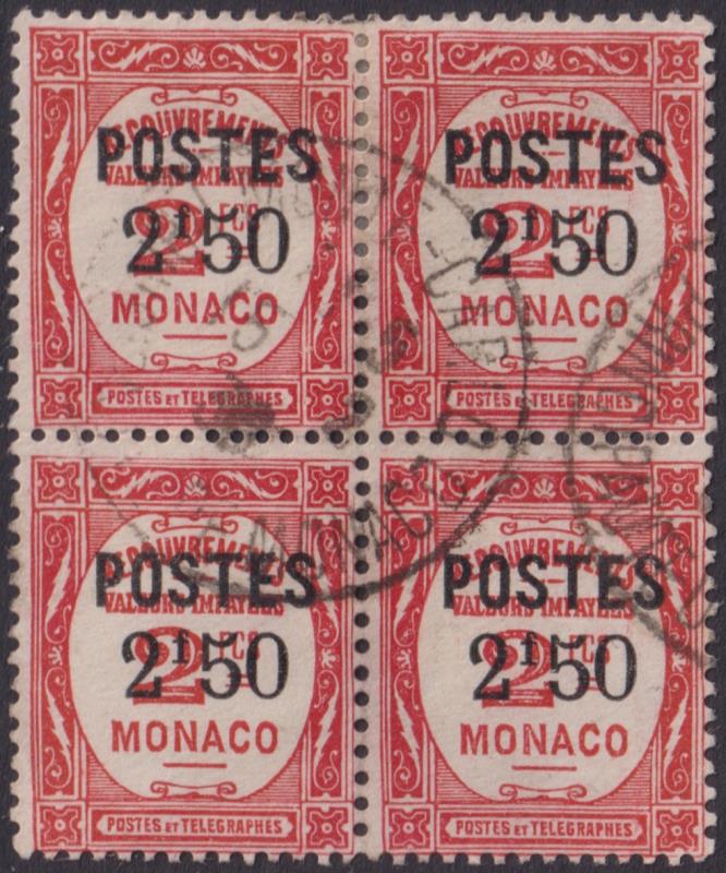 Monaco 1938 2F50 on 2F Postage Due scarlet block of 4. SG 162. Cat £168. FU. (Image)