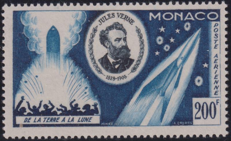 Monaco 1955 200F Jules Verne Airmail (science fiction writer). Design shows portrait & rocket. Top value. SG 539. Cat £48.