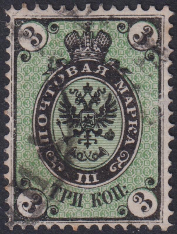 3441 U imageRussia 1866 3K black & green, p14½ x 15, vertical laid paper. SG 25. Cat £130. FU. (Image)