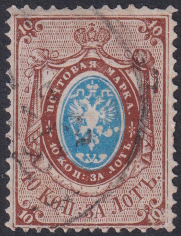 3443 U imageRussia 1866 10K blue & brown, p14½ x 15, vertical laid paper. SG 27. Cat £65. FU. (Image)