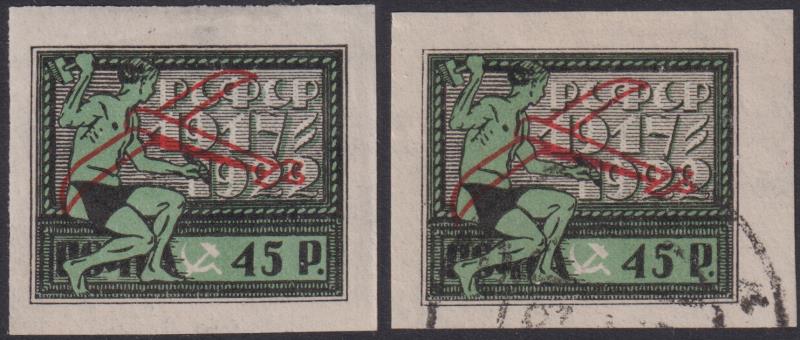 3445 / imageRussia 1922 45R Air 5th Anniv of Revolution black & turquoise-green, with aeroplane outline ovpt, imperf. SG 284. Cat £125. Mint (cat £15) & FU (£110). (Image)
