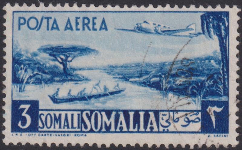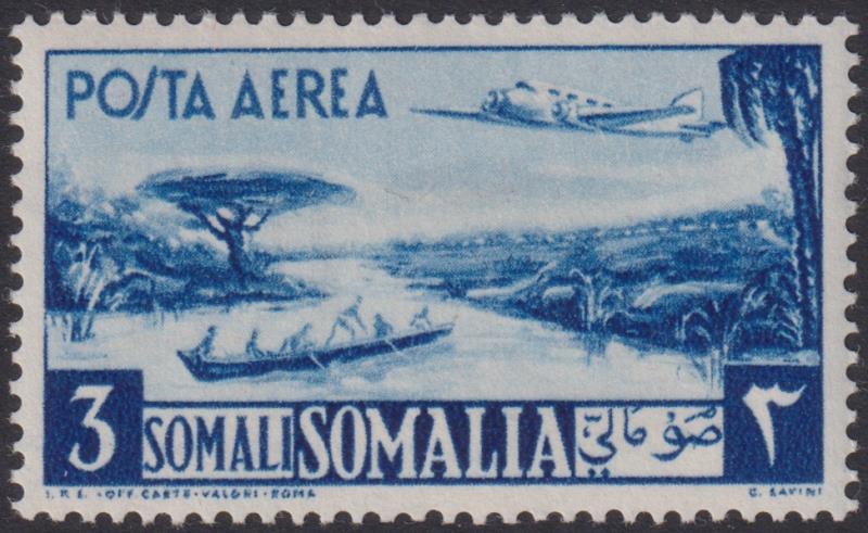 3455 U imageSomalia 1950 3S Airmail blue (plane over river scene). SG 252. Cat £50. FU. (Image)