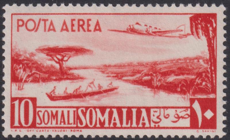 3457 M imageSomalia 1950 10S Airmail orange (plane over river scene). Top value. SG 254. Cat £100. Mint. (Image)