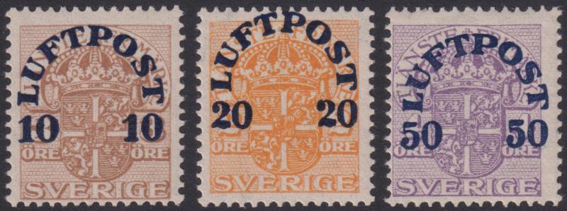 Sweden 1920 "LUFTPOST" airmail ovpts set of 3. SG 120c,d.e. Cat £34. Mint. (Image)