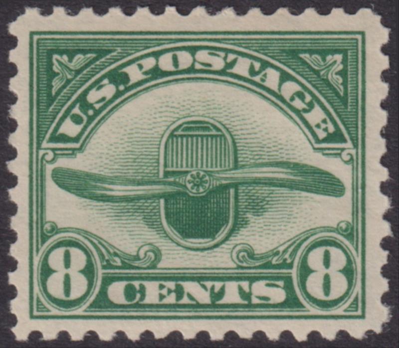 USA 1923 8c Airmail green (propellor), w/c. SG A614. Cat £26 as mint. MUH. (Image)