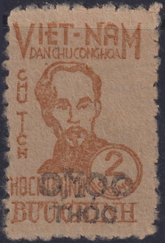 Vietnam-North 1955 100k official ovpt on 2d. SG NO33. Cat £250. No gum as issued. (Image)
