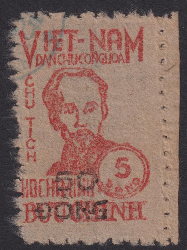 Vietnam-North 1956 50 Dong surcharge on 5d, variety smudged ovpt. SG N61. Cat £110. No gum as issued.