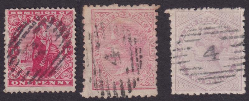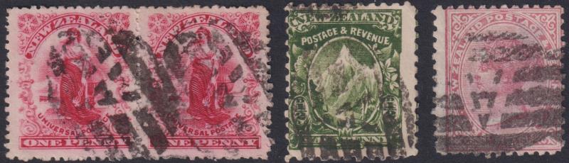 375 U imageAuckland segmented "A" in 6 bars oval obliterator, 3 fine strikes on c1880s 1d SSF p12 x 11½, c1901 ½d Mt Cook p11, & c1905 1d Universal p14 pair. (Image)