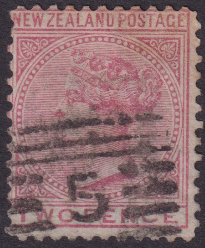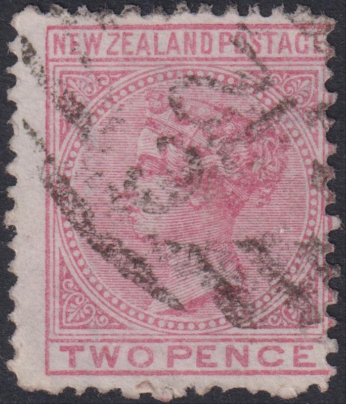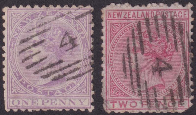 371 U imageAkaroa (CH) 2 fine near complete strikes of "4" barred obliterator on 1d & 2d SSF, p12 x 11½. Also good worn strike on 1d Dominion (3). (Image)
