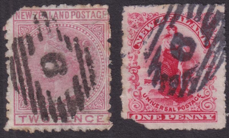 New Plymouth 2 complete worn strikes of "9" barred obliterator on 2d FSF & 1d Universal (both with short corners). (Image)