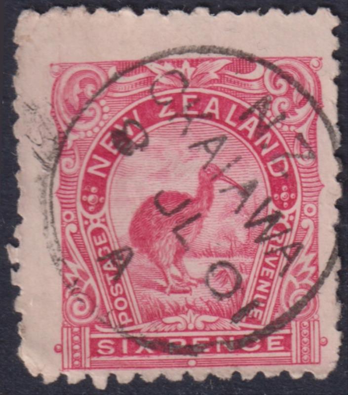 Okaiawa (NU 1882-1988) very fine 8 July 1901 "A" class cancel on 6d red Kiwi. Wooders 5. (Image)