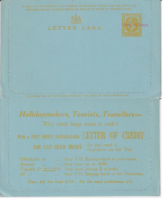 1932 "ONE PENNY" (red) on 2d GV lettercard with "2d" inscription on front, with "Holiday matters..." advt on rear. Samuel