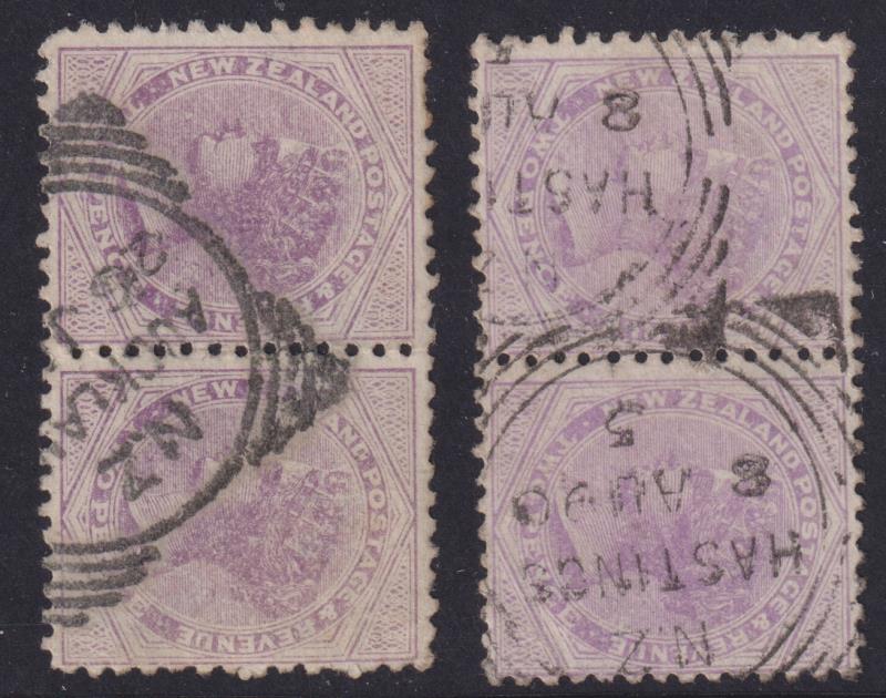 1890 1d SSF rose vert pair, Auckland 16 March 1891 "F" class cancel. C PD2g. Cat $200. FU.