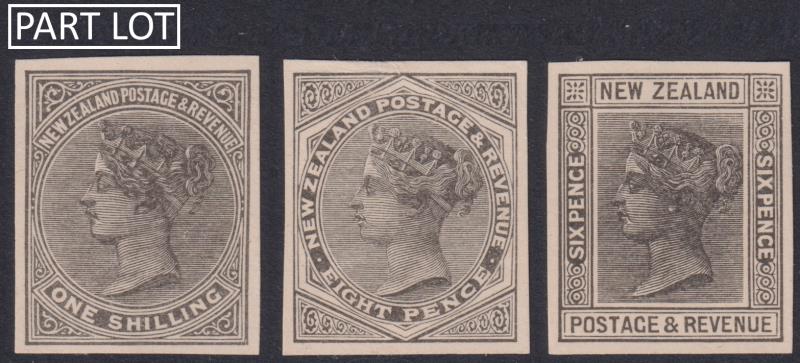 c1900 1d-1/- SSF set of 7 imperf official reproductions in black on unwmk cream paper, produced by W R Bock. Also 6d die II (8v) - see PSNZ Vol I p569. CP priced approx $200.