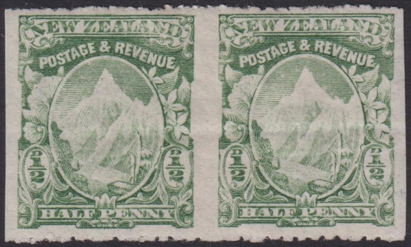 1902 ½d Mt Cook horiz pair, imperf vertically, p14 horiz, Cowan paper, old plate. Pre issue light horiz gum bend. CP F4bz. Cat