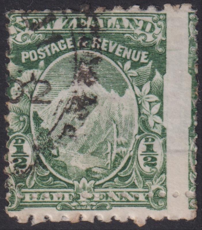 1902 ½ Mt Cook, Cowan, thin, hard, unwmk paper, horiz mesh, mixed perfs 11 & 14. Patching strip at base. FU - part "02" cds. CP