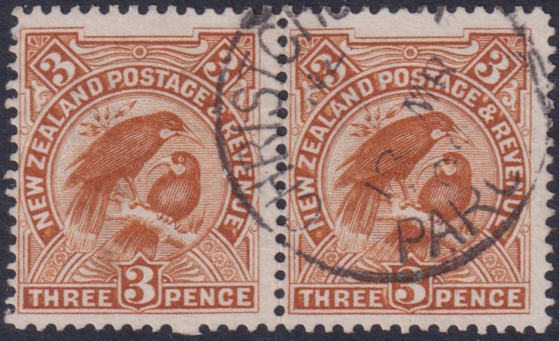 1907 3d Huias reduced pair with crisp, dated cds. Jury cat $50. (Image)