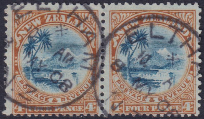 1908 8d Taupo horiz pair, p14 x 12¾-13¼, ex Eltham 8 May 1908. CP E12f. Cat $250. FU. (Image)