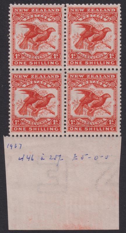1908 1/- Kaka reduced orange-red block of 4 with lower selvedge (selvedge incl "ZEA" letters.) CP E19b1. Cat $4000. (Image)